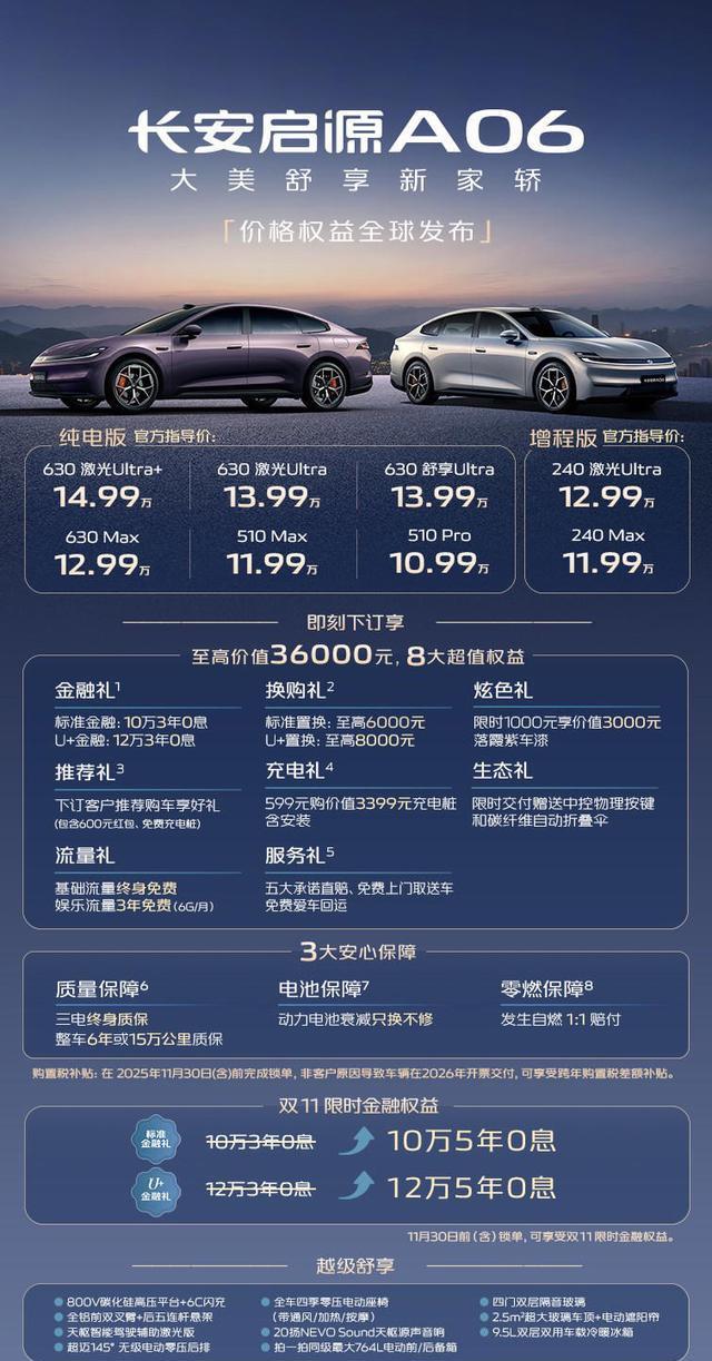 昨天长安启源A06正式开卖,起步价格是10.99万,这车提供纯电和增程两种版本,车身尺寸不小,轴距接近三米,后排可以放平躺人,前备厢也能装不少东西,我看了配置表,发现顶配和次顶配都装了激光雷达,这个设备以前只有在20万以上的车型里才见到,现在11万左右就能买到带激光雷达的车,确实让人感觉挺有意思。