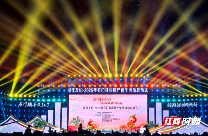 活动开幕式现场。本次活动由湖南省柑橘协会主办,石门县农业农村局、石门县供销社、湖南湘佳牧业股份有限公司、石门县柑橘协会承办,湖南红网新媒体集团承办执行。这场盛会,以“石门橘子又红了,酸酸甜甜刚刚好”为号,汇聚了文艺展演、直播带货、品牌推介等多重环节,成为石门柑橘产业年度产销活动的高光时刻。盛会启幕,一城橘香飘四方对于67万石门儿女而言,这次产销季活动的意义早已超越一场简单的农事庆典,更是一个展现石门产业振兴的立体舞台——传统与创新在此交融,田间与餐桌在此相连。舞台上,一幕幕精彩接连上演:情景秀《金橘耀石门,梦想正启“橙”》拉开序幕,石门五小足球小将与常德市歌舞剧院专业演员共舞,演绎出橘乡的生机勃勃;蒋大为、郁钧剑等歌唱家接连登台,《在那桃花盛开的地方》《家和万事兴》等经典曲目引发全场共鸣;土家歌舞、幽默小品、模特走秀轮番上演,将石门的文化底蕴与时代气息巧妙融合。